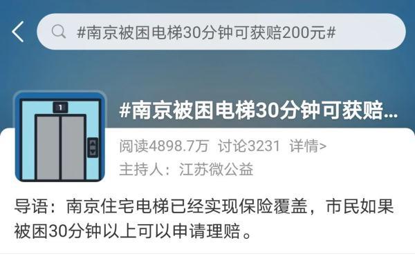 日前,南京電梯被困30分鐘 可獲賠200元上了微博熱搜, 總閱讀量超4000萬。 網(wǎng)友在點(diǎn)贊南京創(chuàng)新舉措、為民辦實(shí)事的同時(shí),也很關(guān)心電梯“上保險(xiǎn)”的覆蓋面及具體賠付落實(shí)情況。 記者從南京市市場(chǎng)監(jiān)管局獲