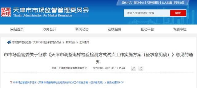 近幾年“奪命電梯”事件頻繁發(fā)生 老舊電梯問題 一直是人們的心頭大患 電梯安全 如何才能做到萬無一失? 日前 《天津市調(diào)整電梯檢驗(yàn)檢測(cè)方式試點(diǎn)工作實(shí)施方案》 在天津市市場(chǎng)監(jiān)督管理委員會(huì)網(wǎng)站 征求意見 征