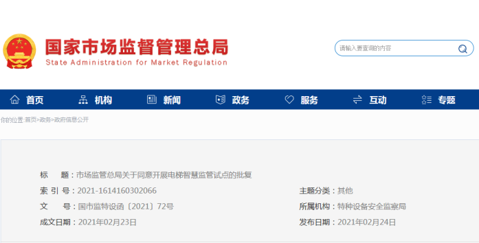 浙江新聞客戶端 |記者 李睿 通訊員 趙文瓊 近日,市場(chǎng)監(jiān)管總局發(fā)文《市場(chǎng)監(jiān)管總局關(guān)于同意開展電梯智慧監(jiān)管試點(diǎn)的批復(fù)》,在上海市、南京市、杭州市、廣州市開展首批電梯智慧監(jiān)管試點(diǎn)。 近年來,杭州加快打造